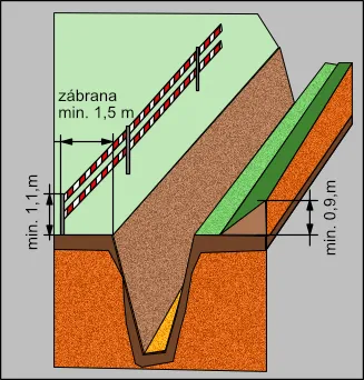 Zona excavată trebuie asigurată împotriva riscului de cădere a persoanelor în interior. Dacă bariera nu îndeplinește cerințele de rezistență, aceasta trebuie amplasată la o distanță mai mare de 1,5 m de marginea zonei excavate. Bariera poate fi, de exemplu, o balustradă (parțial portabilă), un marcaj de siguranță (min. 1,1 m înălțime), un obstacol (min 0,6 m înălțime), pământ din zona excavată (depus în stare liberă la o înălțime de cel puțin 0,9 m).